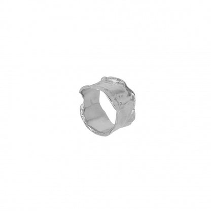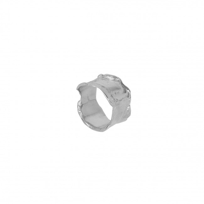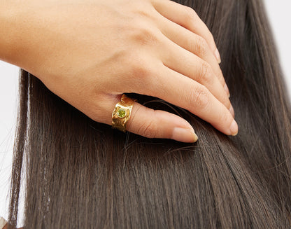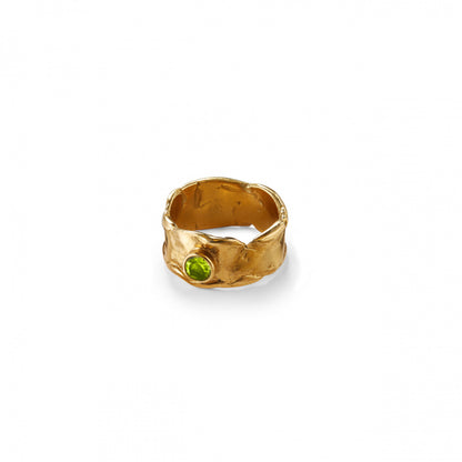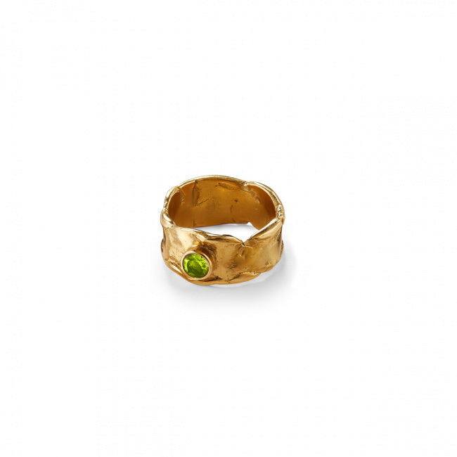 This tactile band ring has edges that curl and undulate, and is set with a 5mm peridot. It is handcrafted from recycled Sterling silver in our London studio through the process of lost wax casting. The ring measures 1cm across and is also available in 18ct gold plated recycled Sterling silver.