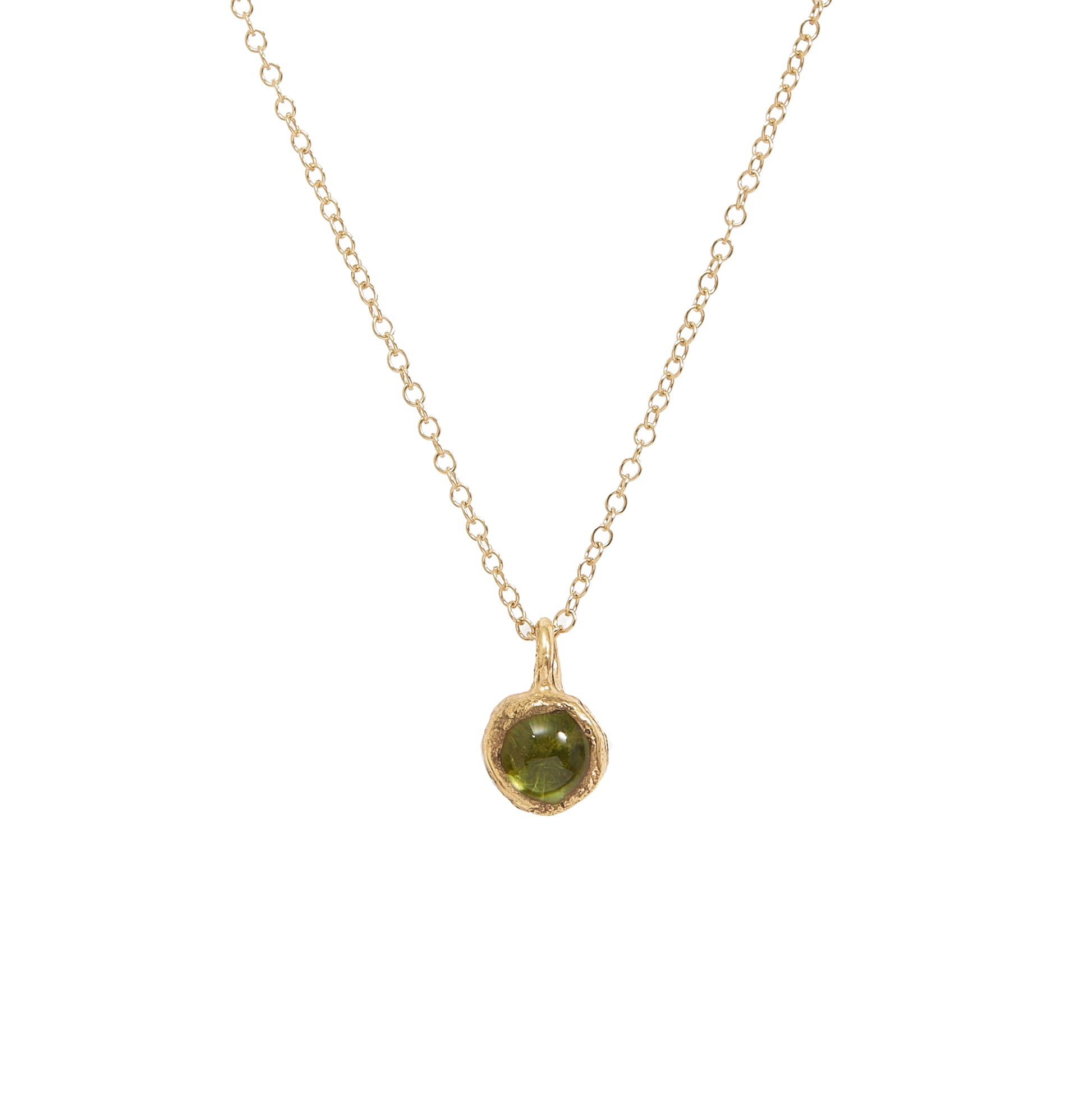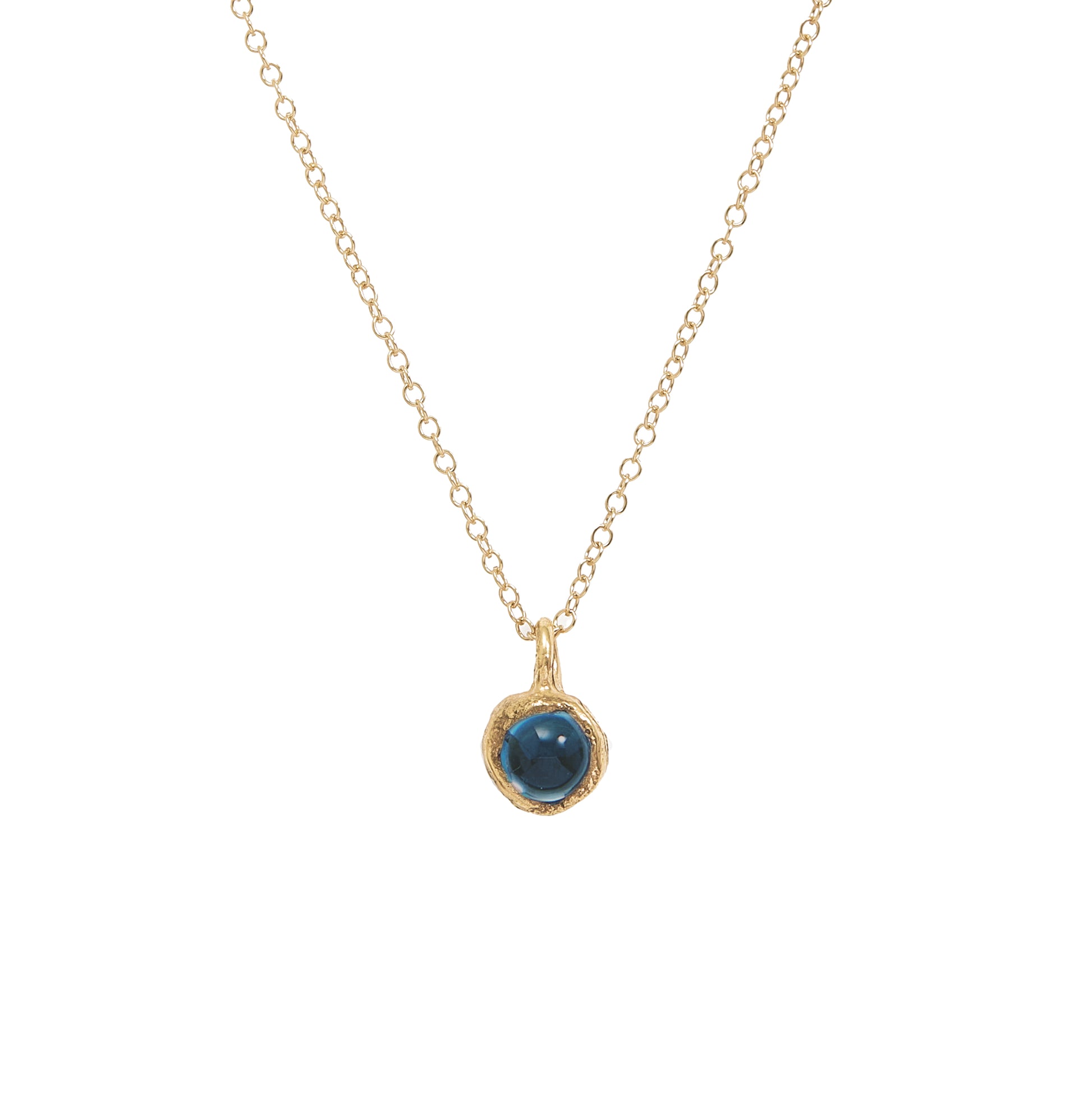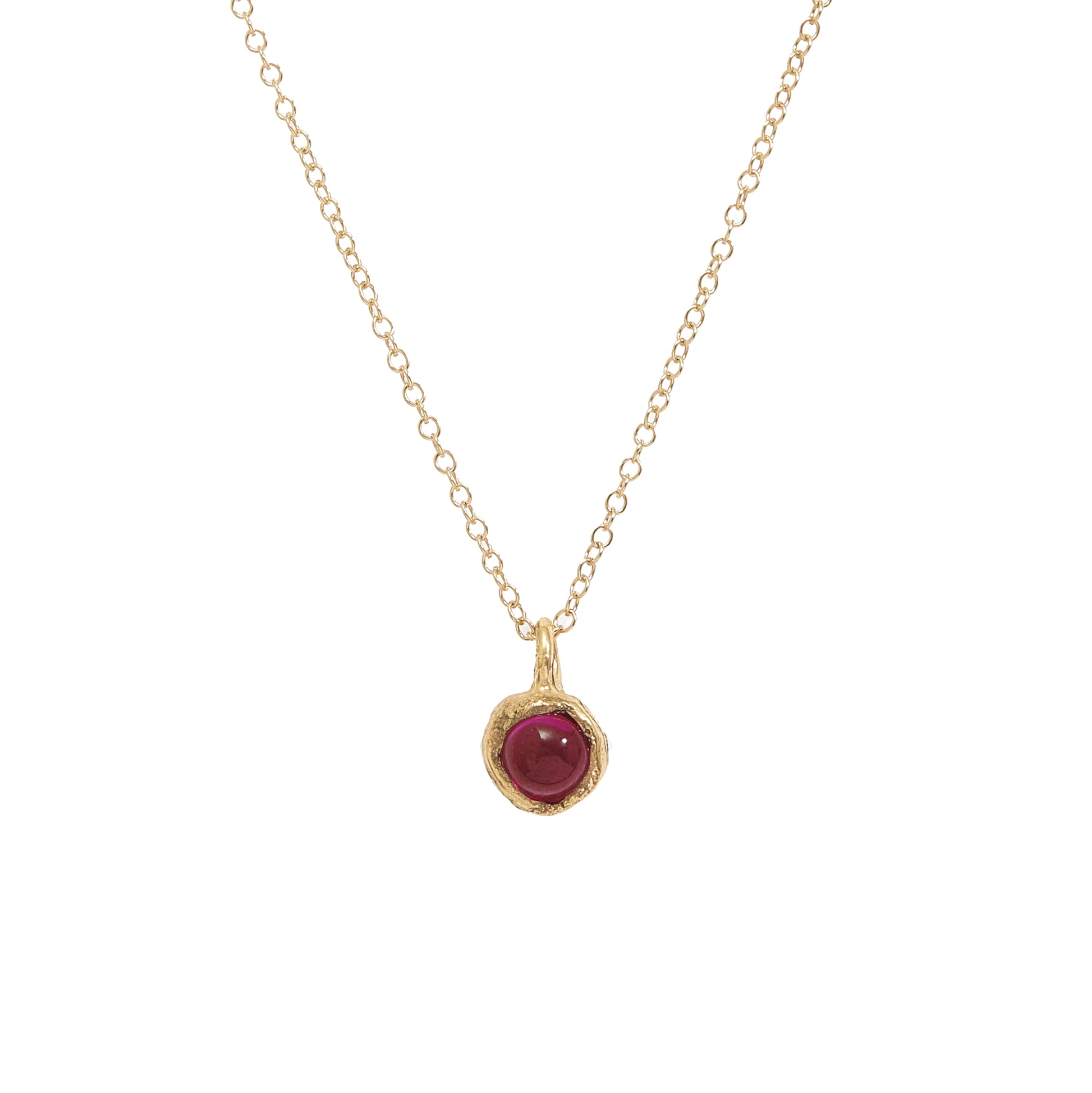 This Callia necklace is handmade in our London studio through the process of lost wax casting from recycled sterling silver and 24 carat gold plating. A vibrant 6mm cabochon gemstone nestles in a setting with an organic form. The pendant measures 1.3cm and hangs from a 46cm gold filled chain.