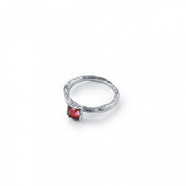 This beautifully organic Clio ring is created in our London studio through the process of lost wax casting. The square setting is specially created to hug a 4mm pink sapphire. The ring is available in either recycled Sterling silver, recycled 18 ct gold plated Sterling silver or 9ct recycled gold. The setting measures 10mm x 8mm and the band is 2mm.