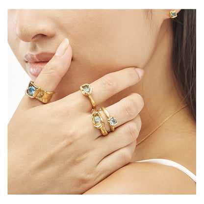 This beautifully organic Gaia ring is created in our London studio through the process of lost wax casting. The oval setting is specially created to hug a 4mm aquamarine whilst leaving gaps around the gem. The ring is available in either recycled Sterling silver, recycled 18 ct gold plated Sterling silver, or 9ct recycled gold. The setting measures 13mm x 8mm and the band is 3.5mm.
