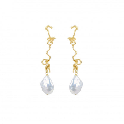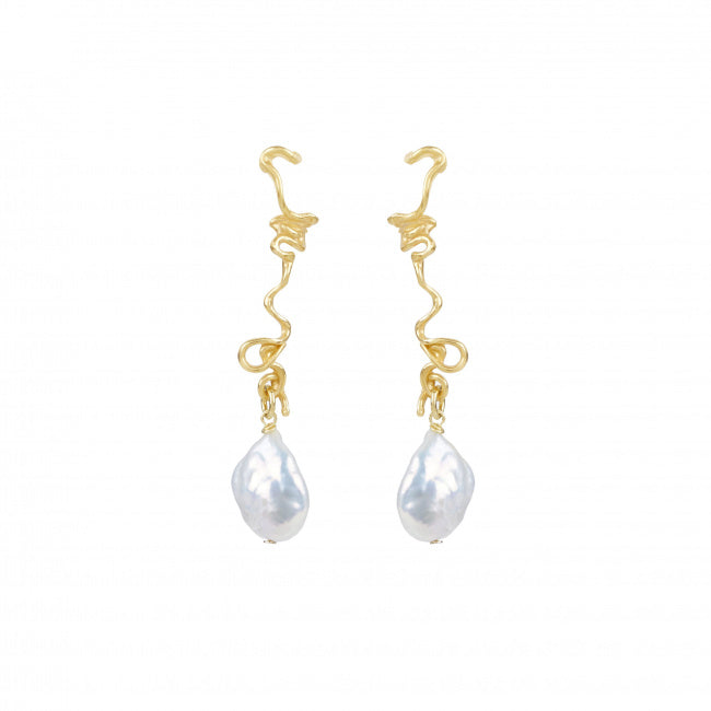 These effortlessly elegant earrings have white baroque pearls that hang from flowing and curling gold vermeil drops. They are created in our London studio through the process of lost wax casting and as no two pearls are the same, each pair will vary slightly.