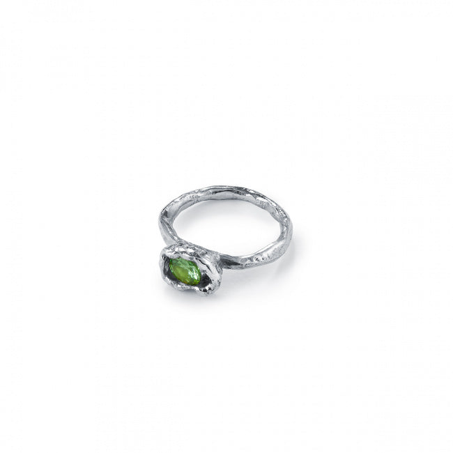 This beautifully organic ring is created in our London studio through the process of lost wax casting. The setting is specially created to hug a 5mm tsavorite and leaves spaces around the stone. The ring is available in either recycled Sterling silver, recycled 18 ct gold plated Sterling silver or 9ct recycled gold. The setting measures 10mm x 8mm and the band is 2mm.