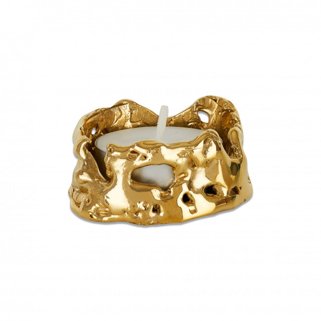 This tea light holder is created in our London studio through the process of lost wax casting from 18 carat gold plated brass. The tea light holder's molten form appears to be an extension of the dripping candle. The pieces are tactile and elegant; simple but impactful.