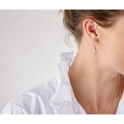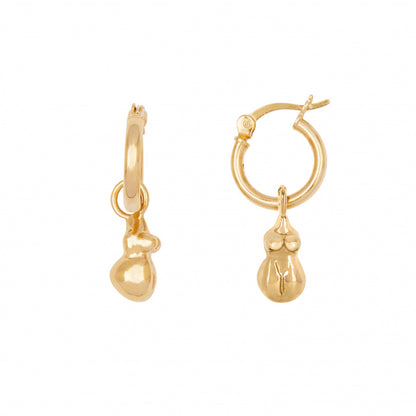 As part of the "Wobbly Bits" collaboration between French artist Laetitia Rouget and Deborah Blyth, these earrings are crafted in our London studio through the process of lost wax casting. The bodies measure 15mm and are made from 18 carat gold plated recycled brass, the 1cm hinged hoops are gold plated silver.