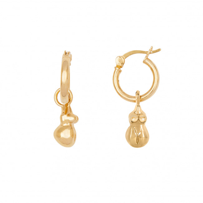 The Wobbly Bits hoop earrings have a small female torso hanging from a hinged hoop.
